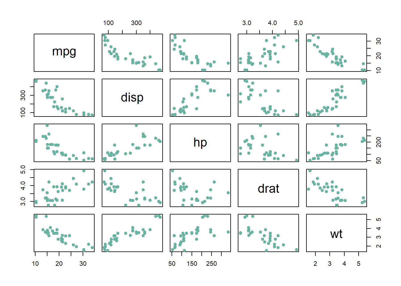 num.vars <- mtcars[ , c(1,3:6)]