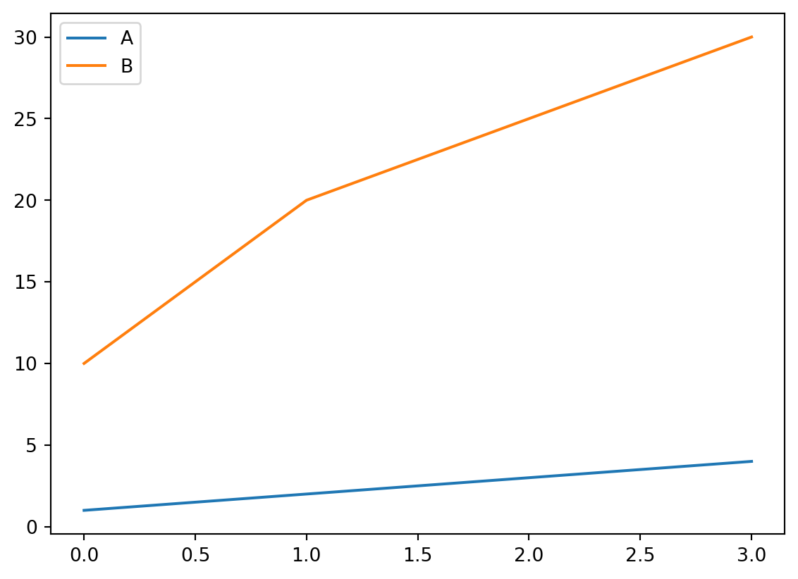 data = {'A': [1, 2, 3, 4], 'B': [10, 20, 25, 30]}